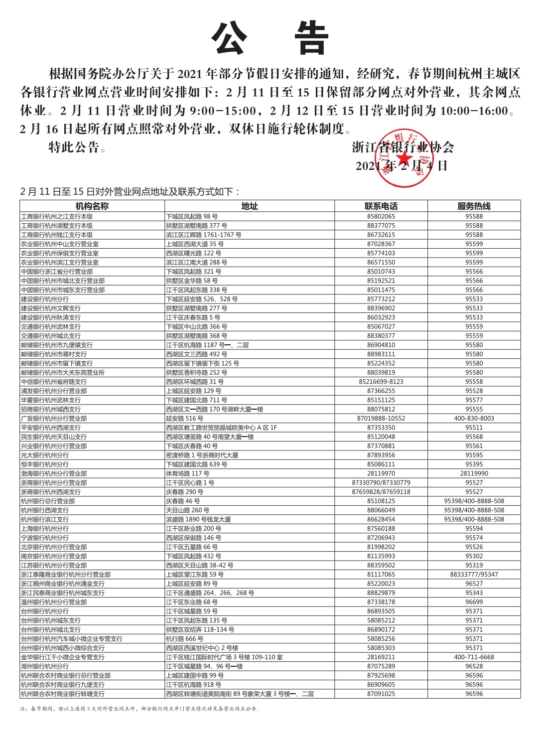 公 告根据国务院办公厅2025年节假日安排,10月1日至10月3日杭州地区各银行开门营业网点如下: