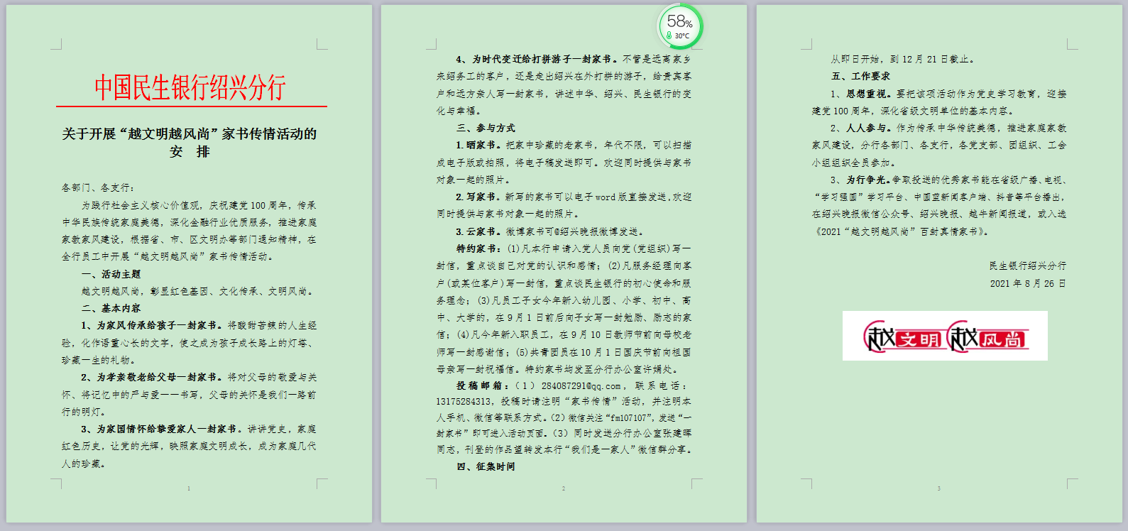 8月26日,民生银行绍兴分行发出《关于开展“越文明越风尚”家书传情活动的安排》,向全体员工提出为家风传承给孩子一封家书、为孝亲敬老给父母一封家书、为家国情怀给挚爱家人一封家书、为时代变迁给打拼游子一封家书。